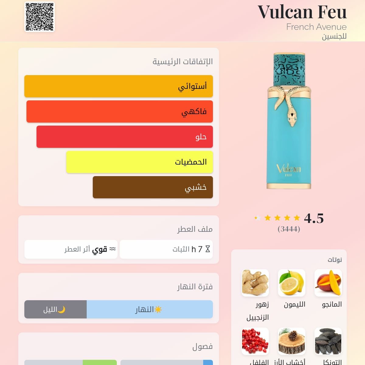 Vulcan Feu French Avenue عطر زهري للجنسين. هذا عطر جديد Vulcan Feu صدر عام 2025. إفتتاحية العطر المانجو, الليمون, الزنجبيل و الراوند; قلب العطر الفلفل الوردي, الياسمين, البنفسج و حلوي اللوز; قاعدة العطر تتكون من حبوب التونكا, خشب الأرز, الآمبرغريس و الطحالب.
